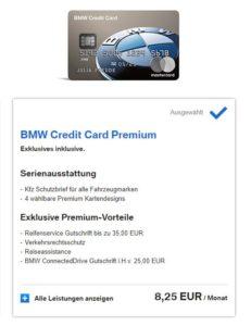 Die Premiumkarte des Automobilherstellers BMW kostet 8.25 Euro pro Monat. Eine Ersatzkarte kostet 15 Euro, eine Notfallkarte wird kostenlos auf Reisen ins Ausland zugestellt. Innerhalb der Eurozone sind die Transaktionen mit der Karte kostenlos, außerhalb bezahlt man 1,95 Euro vom Umsatz. Für Bargeldabhebungen am Schalter bezahlten Kunden in der Eurozone mindestens 5 Euro oder 3 Prozent vom ausgegebenen Betrag. In anderen Ländern kommen noch einmal 1,95 Euro an Spesen dazu. Für die Papierabrechnung ist ein Euro zu bezahlen, online Kontoauszüge sind kostenfrei. Wer die Teilzahlungsfunktion nutzt, bezahlt 9,38 Euro Zinsen.